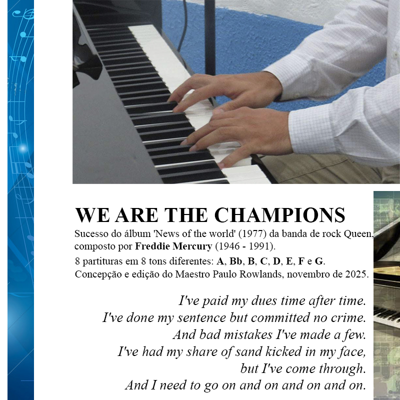 Com a Partitura de We Are The Champions, obtenha 8 partituras da famosa canção em 8 tons diferentes, acompanhadas de melodia, cifras e letra. Um documento de 19 páginas em formato PDF, ideal para músicos e fãs do Queen. Adquira agora e aprimore suas habilidades musicais com a concepção e edição do renomado Maestro Paulo Rowlands.